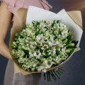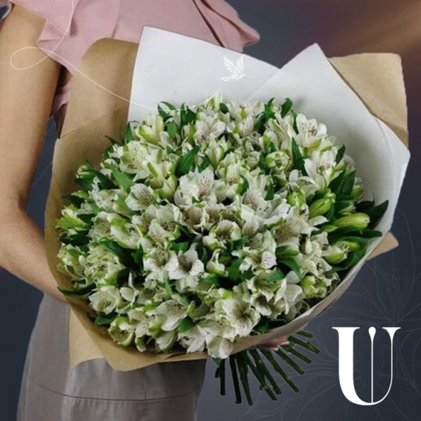 Классический монобукет из 25 белых альстромерий в крафте с атласной лентой - это изысканный и стильный подарок, который станет незабываемым сюрпризом для любого торжества или особого случая. Альстромерии в составе букета известны своей стойкостью и долгим сроком жизни, а также визуальной легкостью, свежестью и нежностью.