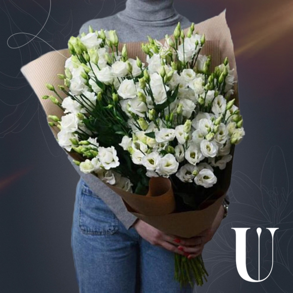 Бкет из 15 белых эустом в крафте с атласной лентой - это стильный и изысканный подарок, который подойдет для любого повода. Эустома (лизиантус) - это нежный цветок, родом из Америки, напоминающий миниатюрную розу. Они очень стойкие и долго будут радовать получателя своей красотой и элегантностью.