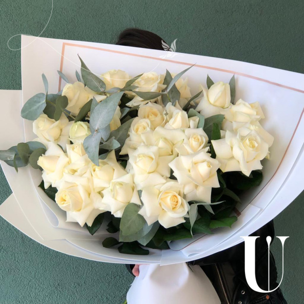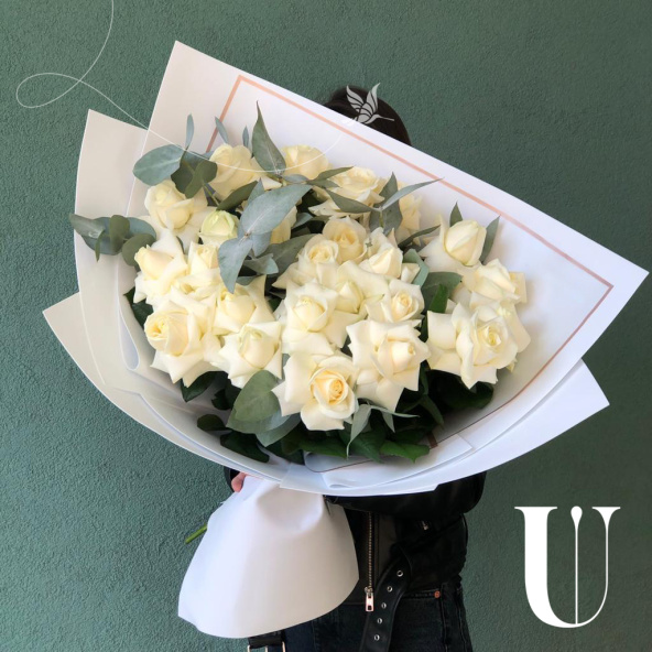 21 белая роза, эвкалипт, упаковка.