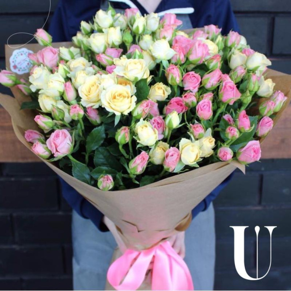 Кустовые розы в букете. Элитные кустовые розы сорта Бомбастик в букете, оформленным в декоративную модную бумагу крафт с атласной лентой