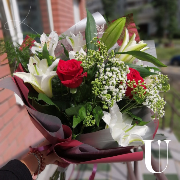 Яркий и сочный букет из лилии и роз