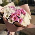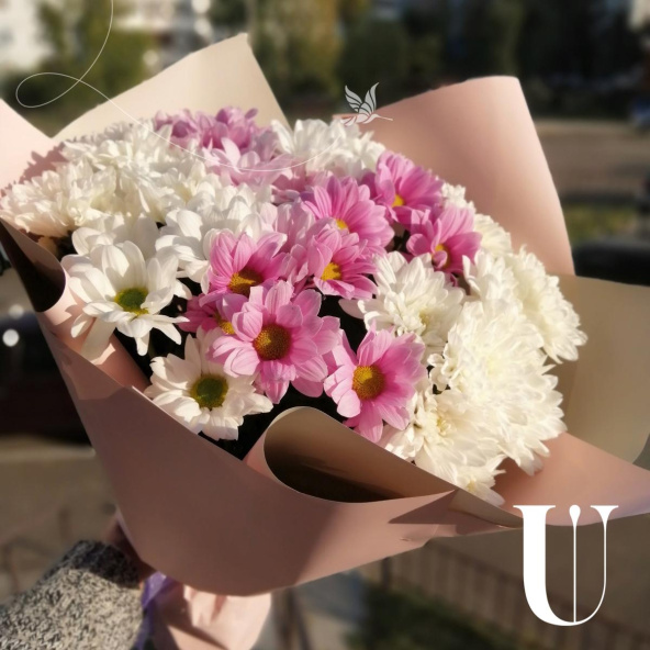 Нежный и пышный букет из кустовых хризантем в стильной упаковке!