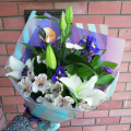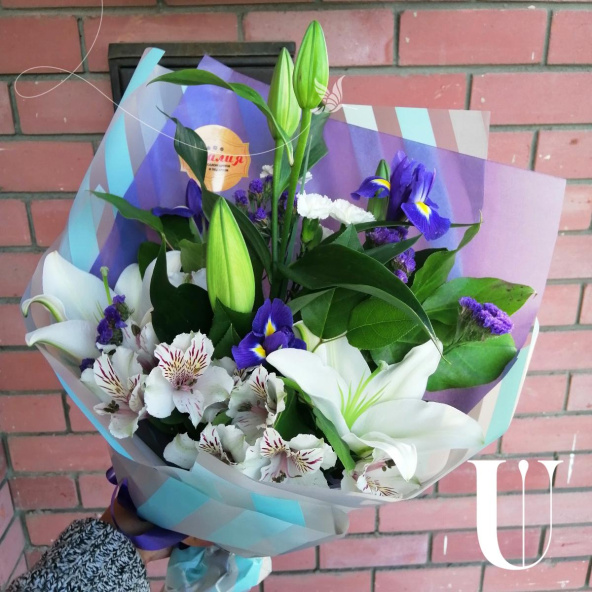 Шикарный, яркий букет с ирисами и лилией и альстромерией!)
