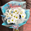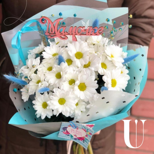 Нежный и пышный букет из кустовых хризантем в стильной упаковке и с топпером!