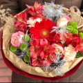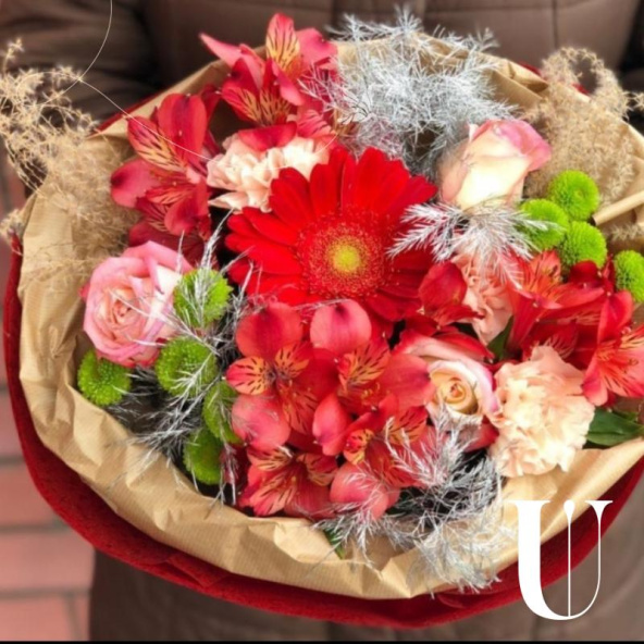 Яркий букет из роз, герберы, сантини и диантусов с серебристым аспарагусом в упаковке!