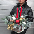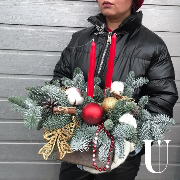 Елочные игрушки - 5 шт. хлопок натуральный - 3 шт. шишки натуральные - 3 шт. свеча красная - 2 шт. корица - 2 шт. нобилис - 2 шт. оазис - 1 шт. кашпо деревянное - 1 шт