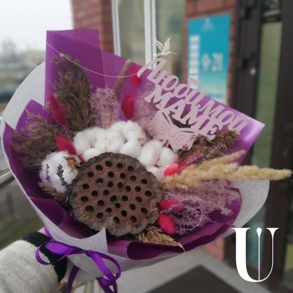 - Натуральным хлопком и сухоцветами в стильной упаковке будет радовать вас долгие годы!