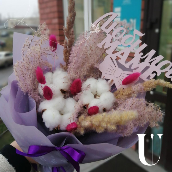Нкжный букет из натурального хлопка и сухоцветов в стильной упаковке будет радовать вас долгие годы!