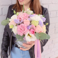 - Лукошко свежих цветов в розово-сиреневой гамме